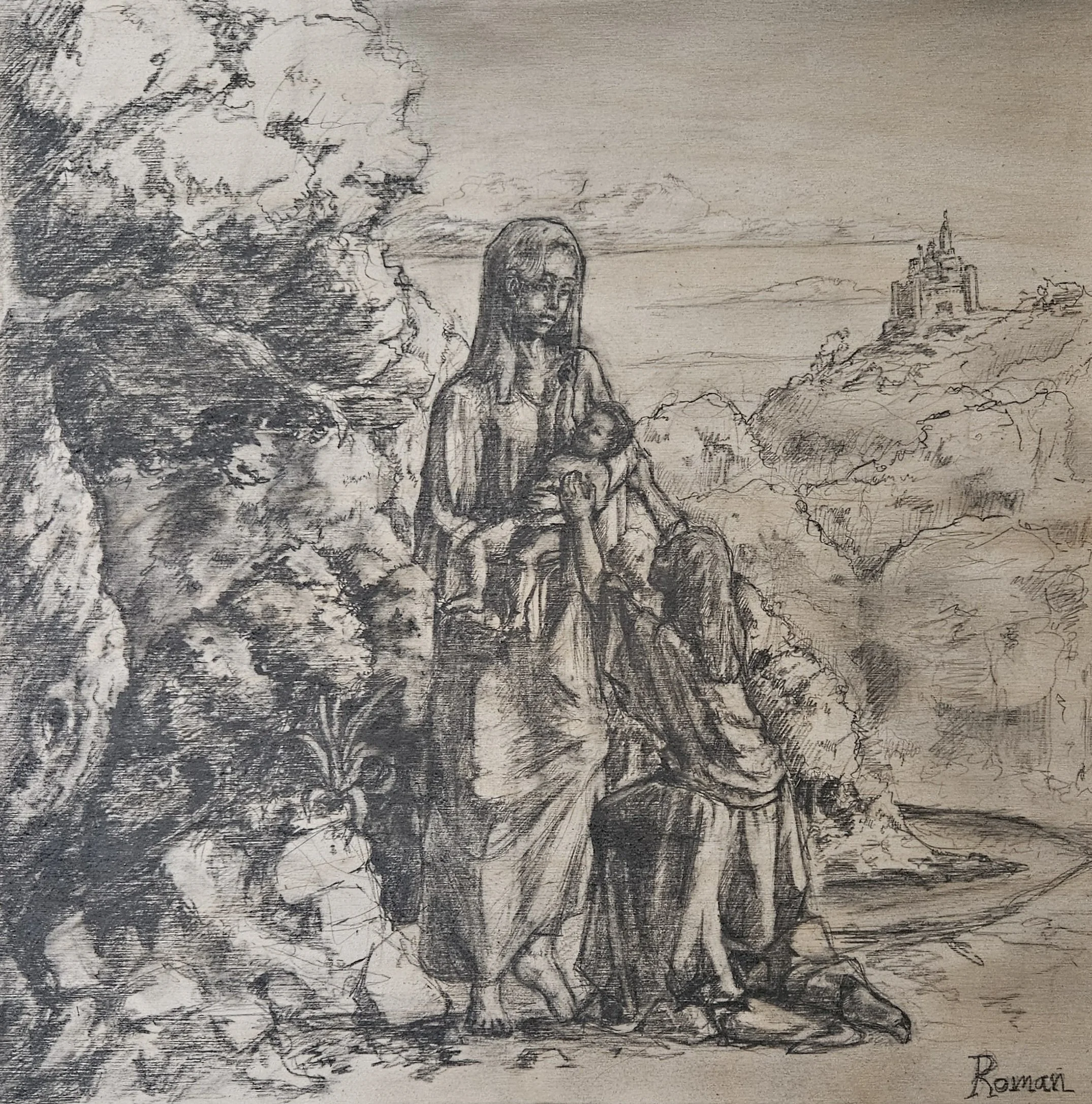 My current work shows a mother and her child. The woman kneeling is the grandmother. I wanted to portray the child’s mother as hesitant to let go of her child, yet the grandmother really wants to see and hold the new family member. The painting is entirely out of my head with no references; however, I took some inspiration for the left side of the forest from “The Swing” by Jean-Honoré Fragonard. One particularly challenging part of the painting was the robes. To draw the robes accurately I drew out the bodies of both figures, then drew the robes over the top, which ended up taking a lot of time.